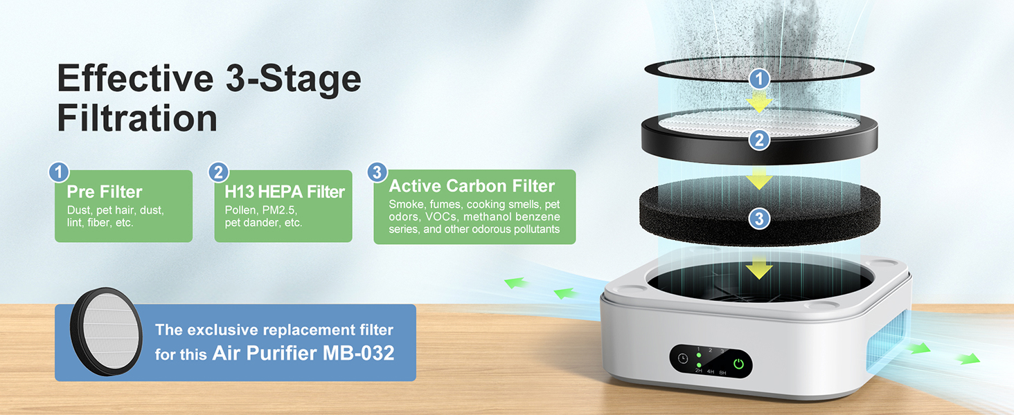 - 3-Stage Efficient Filtration and Better Quality Filter: The air purifier for home consists of a pre-filter, a true HEPA filter, and an activated carbon filter. Effectively purify most air pollution, including dust, pollen, smoke, odors, PM 2.5 and pet danders. The filter included has been upgraded with better material